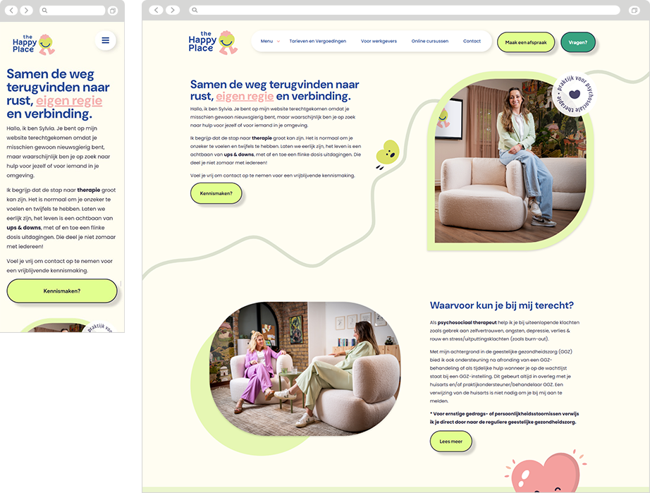 Voor The Happy Place mochten wij werken aan de complete visuele identiteit. Van het logo en de huisstijl tot het website-ontwerp en diverse communicatiemiddelen. Alles met één doel: een herkenbare, warme en consistente uitstraling creëren die vertrouwen wekt bij de doelgroep.
